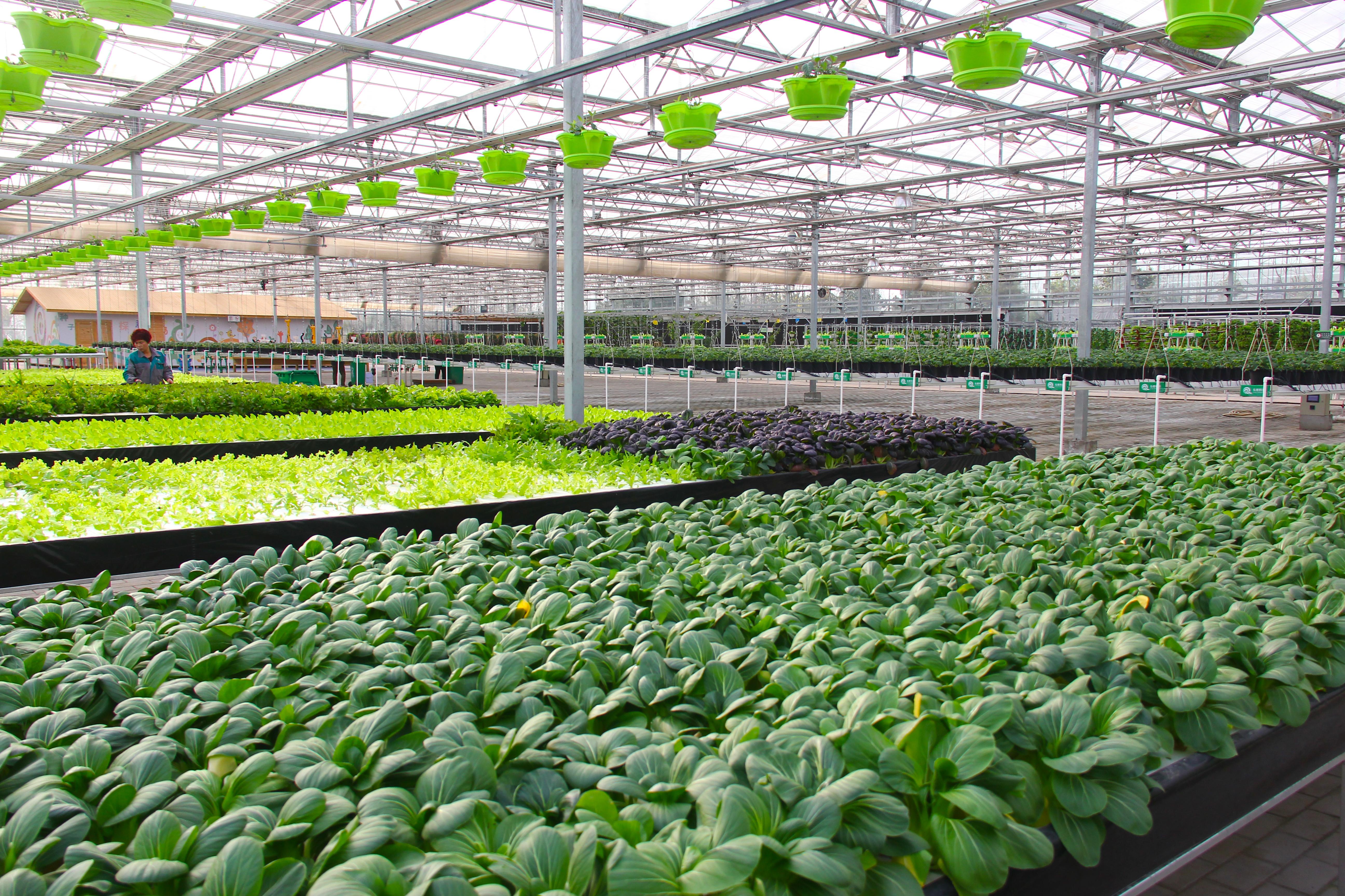 农业科技馆以现代、科技、创意农业为主题,展示了多层漂浮栽培技术、立式管道栽培技术、多段茄子栽培技术等11项先进栽培技术,实现了作物周年连续生产。入口处右侧是人工光植物工厂,下方的绿叶蔬菜叶片肥嫩、长势喜人,该技术通常应用在军事等高新领域中,如在潜艇里装备这些设施设备,就可以不受土地光照限制生产新鲜蔬菜。